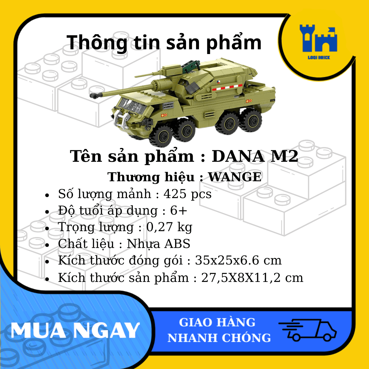 Sản phẩm thuộc thương hiệu WANGE nổi tiếng, gồm 425 mảnh ghép tinh xảo, giúp bạn tự tay tạo nên một chiếc pháo tự hành DANA M2 mạnh mẽ và chân thực đến từng chi tiết.